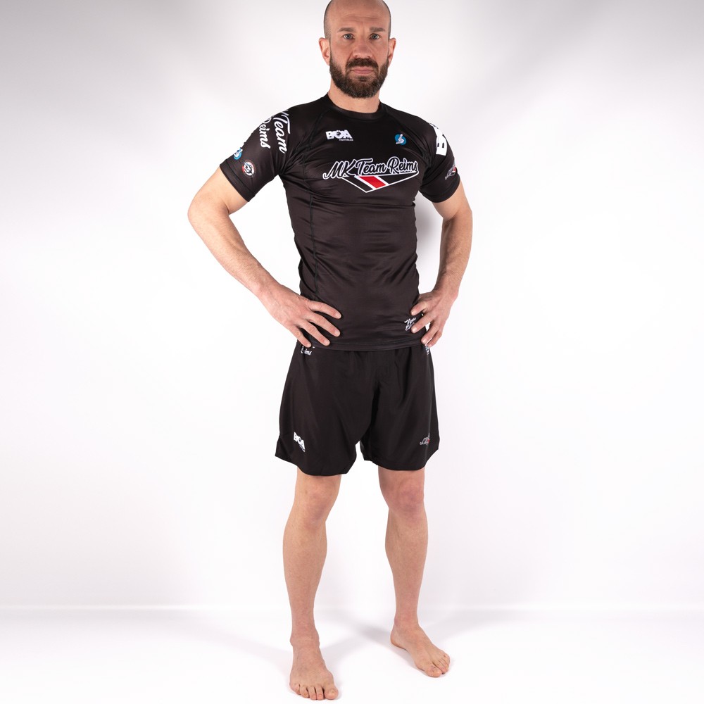 Rashguard de manga corta para grappling fabricado en colaboración con MK Team, una asociación deportiva de jiu-jitsu brasileño con sede en Reims